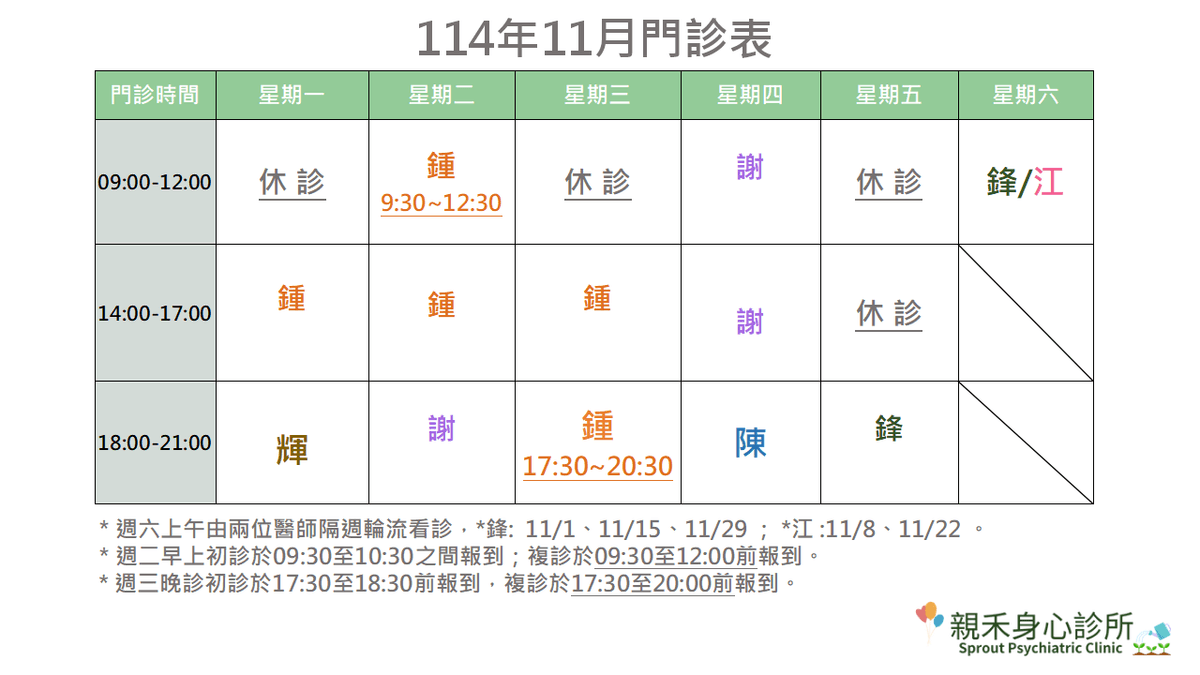 - 週二早診於09:30開診,初診於早上10:30前報到,複診於12:00前報到。
