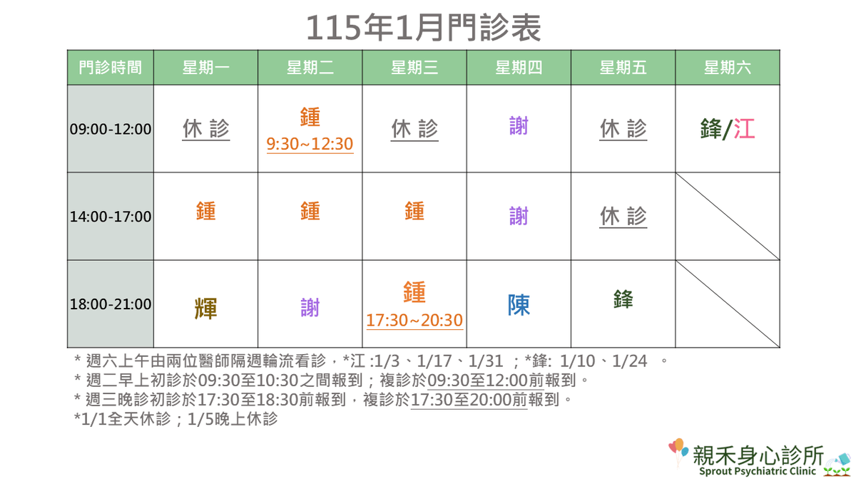 - 週二早診於09:30開診,初診於早上10:30前報到,複診於12:00前報到。