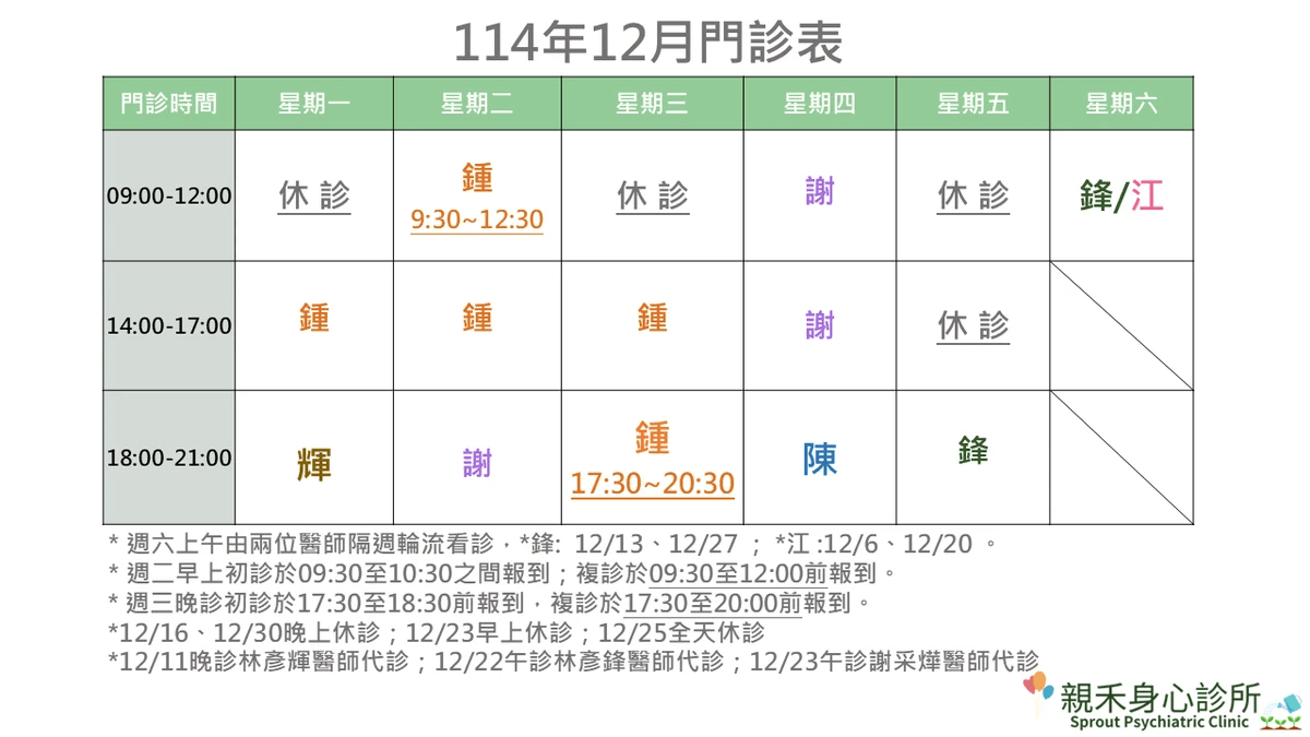 - 自費項目(心理治療、腦波神經回饋、自律神經檢測與生理回饋等)請先掛門診由醫師評估後安排,所有門診時段皆可安排。